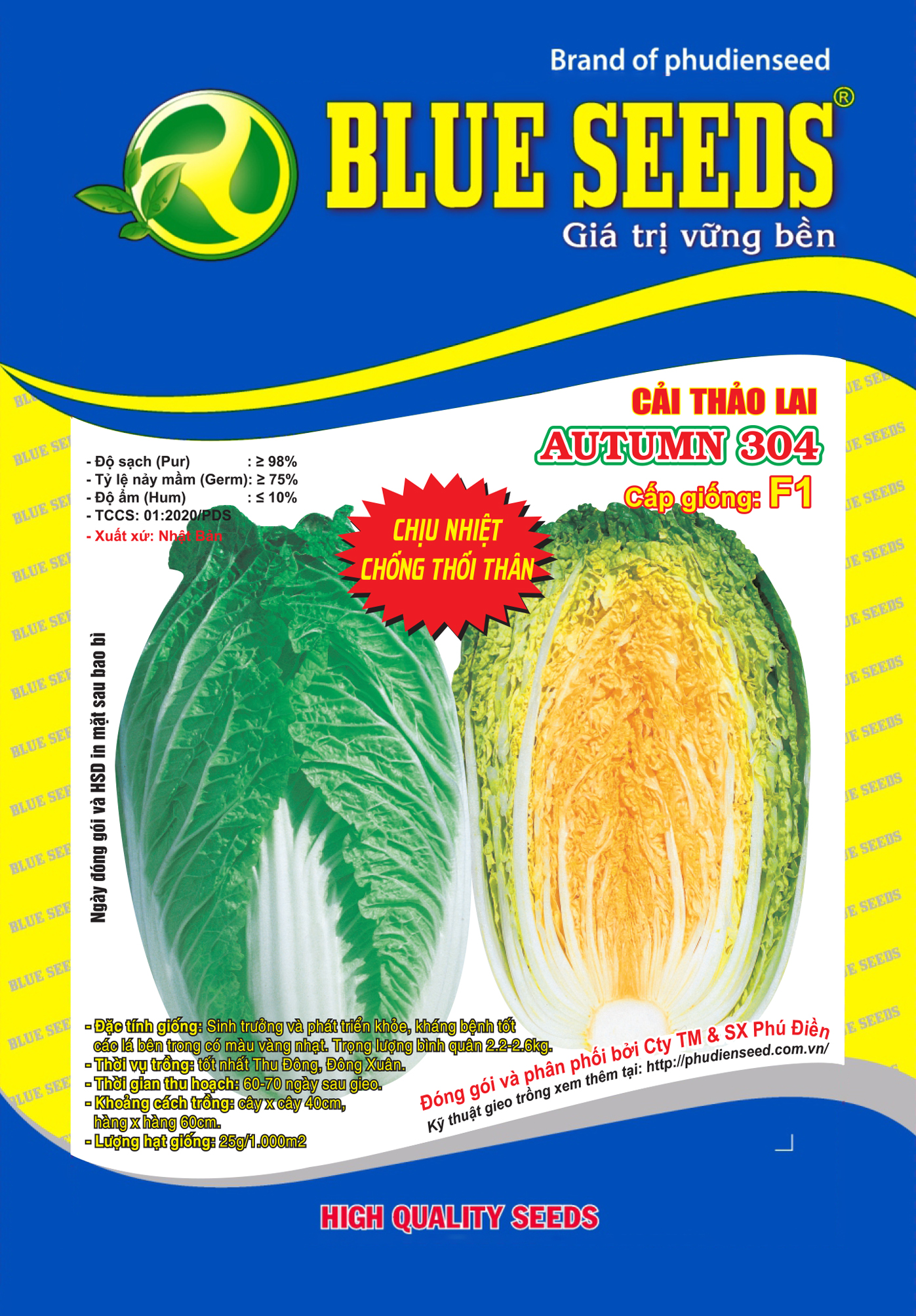 Cải thảo lai F1 AUTUMN 304: Là giống sinh trưởng khỏe, thích nghi rộng, kháng bệnh rất tốt, lá trơn láng, bắp cuộn chặt, dạng tròn, thon dài, trọng lượng bao trung bình từ 1,5-2 kg. Nhiệt độ sinh trưởng, phát triển tốt nhất từ 20-36 ºC. Thời vụ gieo trồng: Miền Bắc từ tháng 8 đến tháng 1 năm sau (dương lịch), vùng khí hậu mát trồng quanh năm. Thời gian thu hoạch: 45-50 ngày sau trồng. Lượng giống gieo trồng 25-30 gam/1000 m².